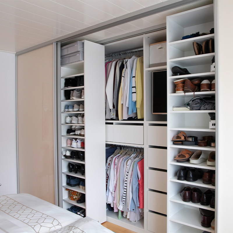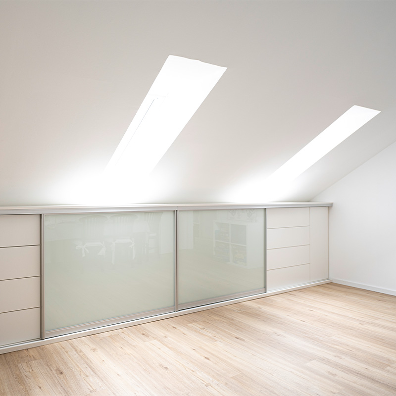 Of course, smaller versions are also possible: for instance, built-in wardrobes under sloping ceilings that make optimal use of the available space. We also use sliding doors as the foundation for walk-in closets or as clever room dividers. The technology has proven itself time and again: transform new room concepts while simultaneously creating valuable storage space!